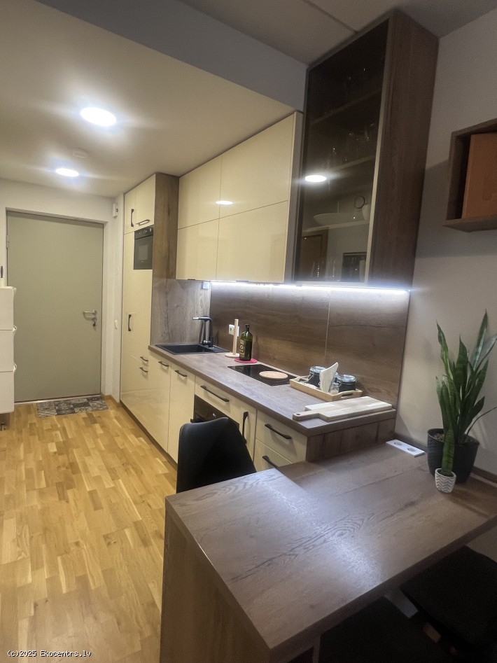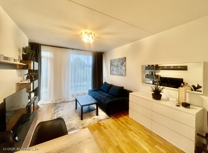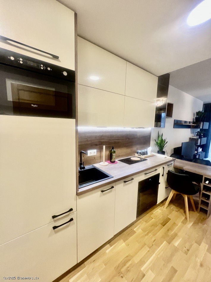 Kompakts studio tipa dzīvoklis ar pārdomāto dizainu un augstās kvalitātes apdari. Panorāmas logi ar franču balkonu un skatu uz zaļo zonu. Cenā ietilpst premium klases virtuves iekārta ar sadzīves tehniku AEG (ledusskapis, plīts, cepeškrāsns, nosūcējs, trauku mazgājamā mašina un iebūvēta mikroviļņu krāsns), ka arī iebūvētie skapji.